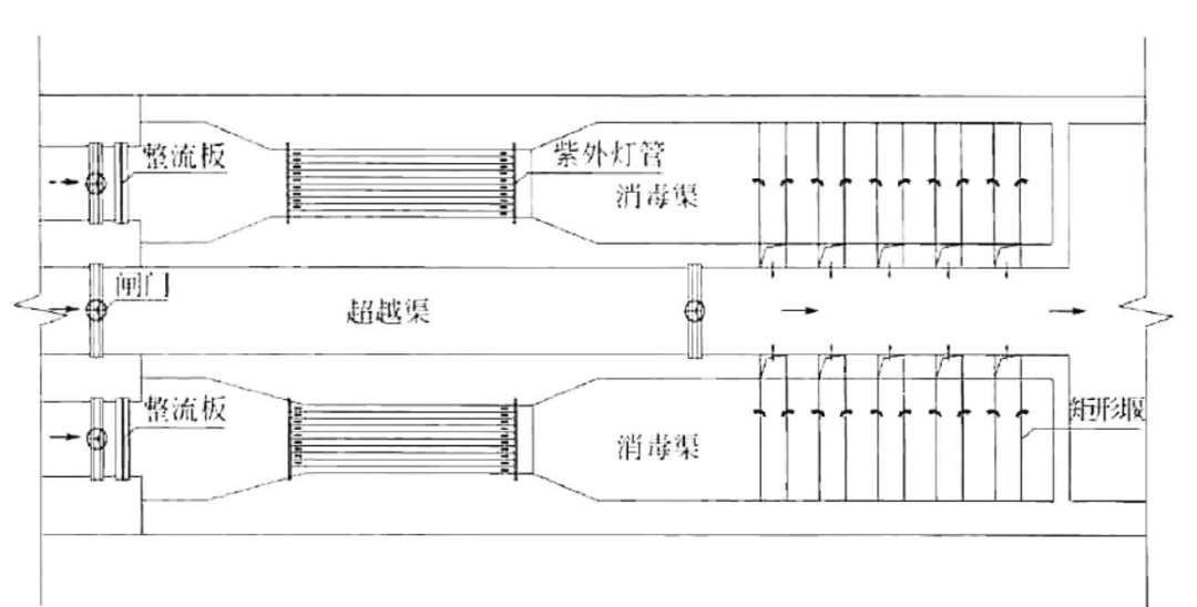 超越渠和消毒渠并列布置,超越渠接入加氯消毒设施进入下游接触池。
