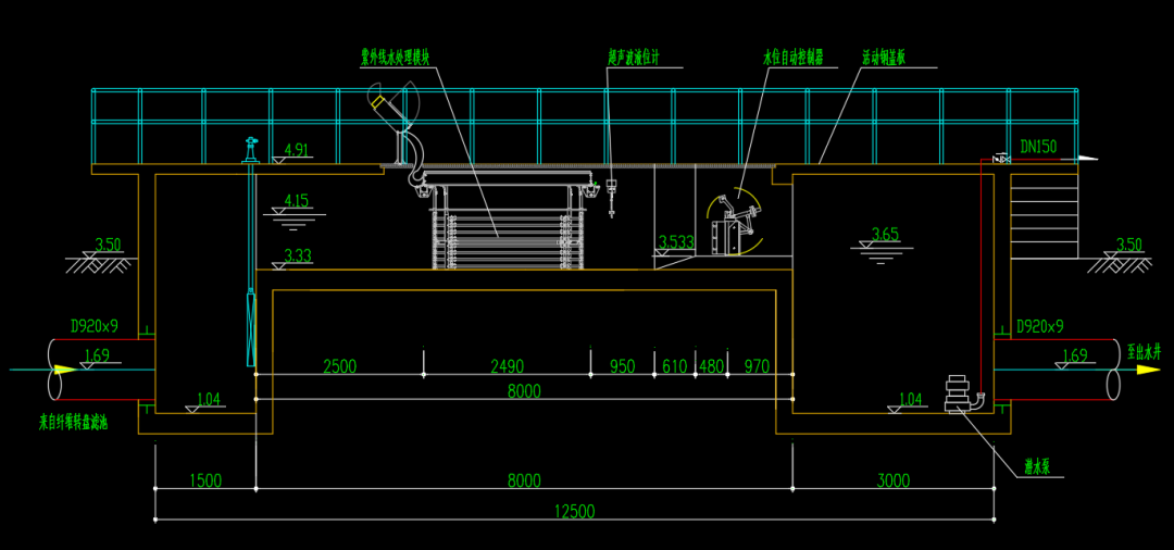 来水管先引入进水配水渠道。配水到几组平行布置的消毒渠。